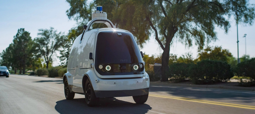 ยานยนต์ขับเคลื่อนอย่างอิสระแล่นไปตามถนนในเมืองสกอตส์เดล รัฐอริโซนา สหรัฐอเมริกา เป็นผลงานของบริษัทสตาร์ทอัพนูโร